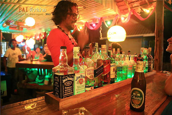 PAI这里的小酒吧挺多的,随便一家都挺有特点,还有就是我们发现老外也喜欢扎堆,有些酒吧里面全是老外,挤得满当当的,在这里遇到的外国人比亚洲面孔要多得多,据说许多曼谷人都没有来过PAI。但是这边的夜生活不晚,到了11点,许多酒吧就打烊了。我们从酒吧离开后,在回酒店的路上,发现之前人满为患的酒吧都关灯了。。个人之见,我觉得这里的感觉比阳朔西街好多了~呵呵!