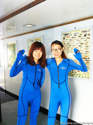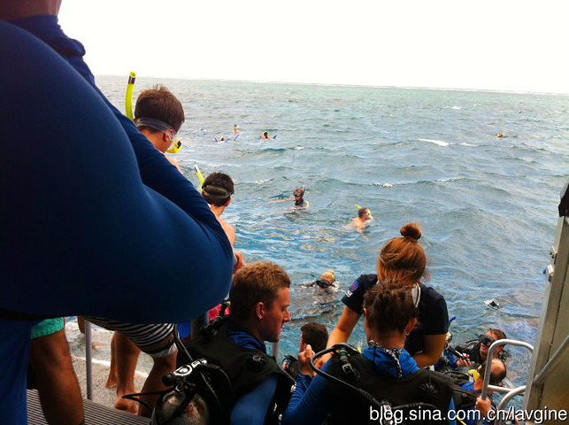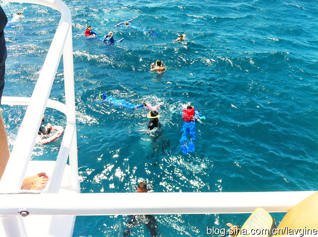 50澳币就这样扔了,没关系!还有浮潜!浮潜是指人漂浮在海面上,带着潜水眼镜也能看到海下面的珊瑚等,但是就没有深潜那么清楚。最适用于我们这些不会游泳的人。船在海中间停泊,呕吐的感觉也慢慢消失,打起精神,换上潜水服,准备拥抱大海!