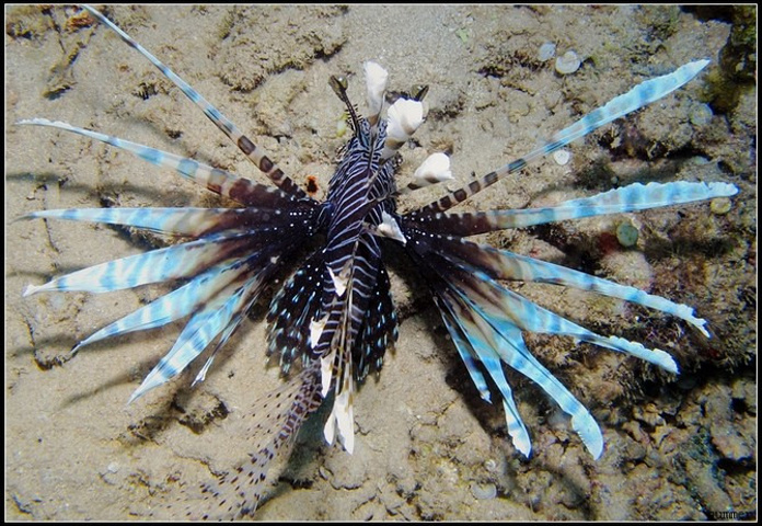 对照了一下鱼书,感觉这只很像印度狮子鱼,大多数狮子鱼都是红黑色条纹,这只是白黑色,而展开的羽鳍则透着淡淡的蓝色。