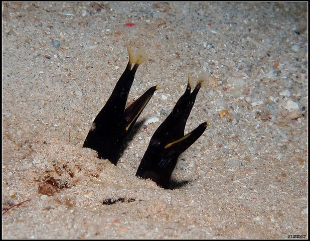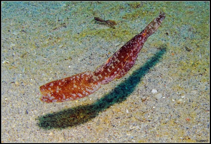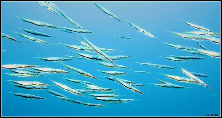 这个名字很形象,剃刀鱼真的象刀片一样,薄薄的,竖着悬在海里,常常一群群在一起,有时候更像一堆漂浮的柳叶。照片中的剃刀鱼被海流带的有些凌乱了,不过依然很美。