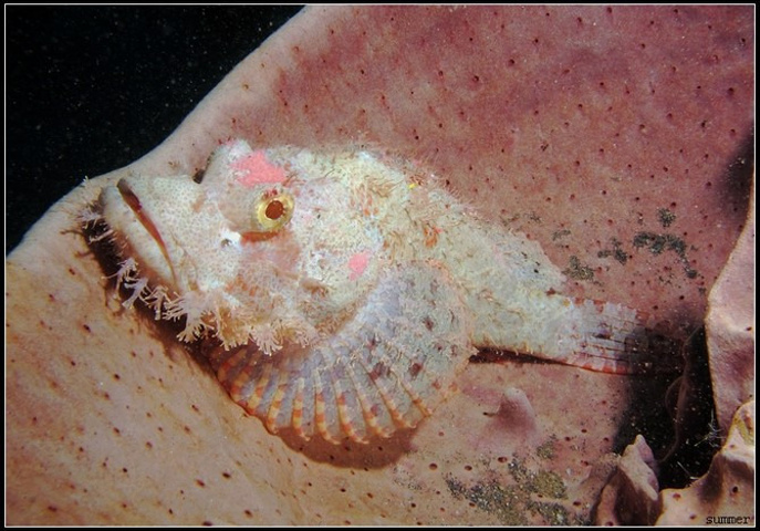 蝎子鱼一般都长的很丑,象大猩猩一样外撅的大嘴巴,高脑门,眼睛有些外突,常常一动不动的趴在珊瑚礁上,但它们的伪装却非常出色,跟周围的环境融为一体,让你以为它只是珊瑚礁的一部分,靠近了,才会从它木讷无神的眼睛看出奥秘所在。不过照片中这条蝎子鱼还是很可爱的,起码看着身上很干净。哈哈哈。