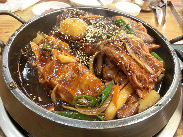 超级大一份!但这已经是small size了!里面有6块大骨架,土豆,面条,年糕。分量足够四个女生吃了!味道不错,很入味,有点像乱炖但是味道不同。这家在弘大,24小时营业,没有中文菜单,这种大杂锅有三种肉,价格不同。除此之外也有石锅饭、汤之类的。我们每次回旅舍都要经过这里,所以决定来试试~