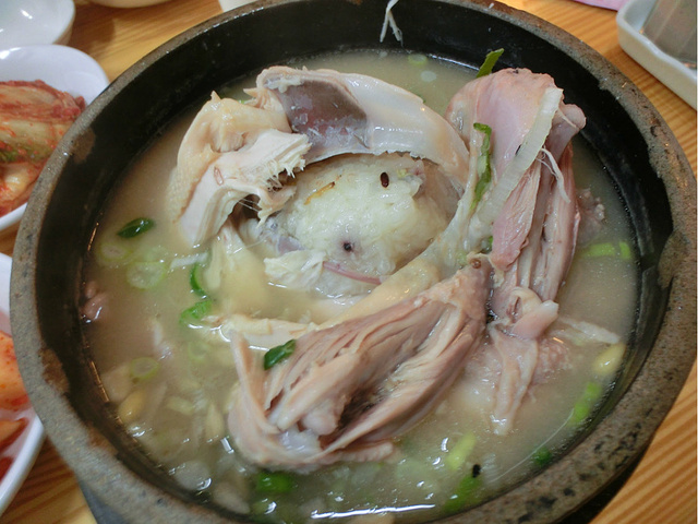 名不虚传 ....用的是一整只鸡炖的汤,里面塞满糯米、红枣、还有一条人参。餐前有一小杯参酒,应该是直接喝的,不过接受无能,我们都倒进汤里了,好好喝~我们两个女生只点了一份,没吃早餐也饱了,还可以留肚子吃晚饭
