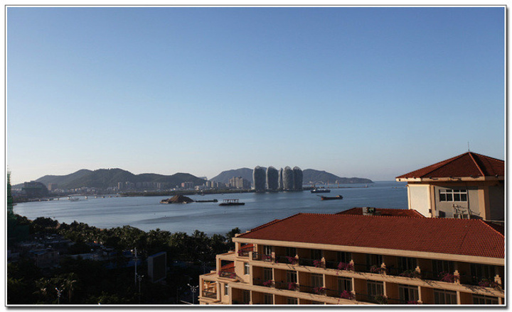 但天公不做美,下起了一阵急雨,我们便坐在房间的阳台上望着雨中若隐若现的凤凰岛标志建筑群,听着雨声、上着网,好不惬意!从楼上阳台看小区园景在楼上远眺附近楼群海景房的优势,站在阳台上可见远处的标志性建筑群来自游记APEC期间,三亚、杭州两城之旅