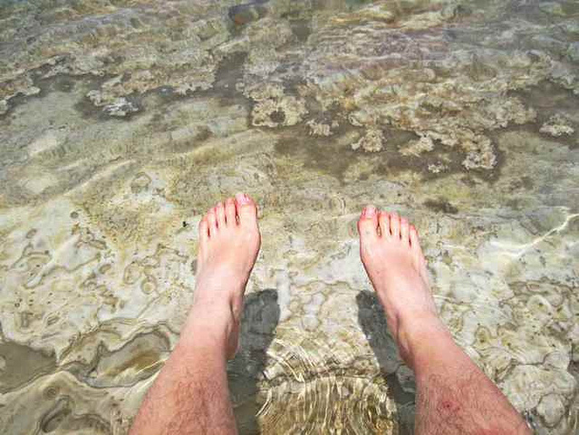 没打算漂浮,就在靠岸的地方泡泡脚,有一种很别扭的触觉,远不像真正的海水那样清爽。水温不冷不热,但高盐度的水让皮肤有微痛的感觉,也像是敷了一层油。脚下不是泥沙,而是盐结晶的石块,都坑坑洼洼的并且很有棱角,也很滑,踩上去极不舒服,还要小心摔倒。从岸上提了一把塑料椅到水边,坐了一会儿才发现裤子都黏了,椅子上也不干净,有盐水