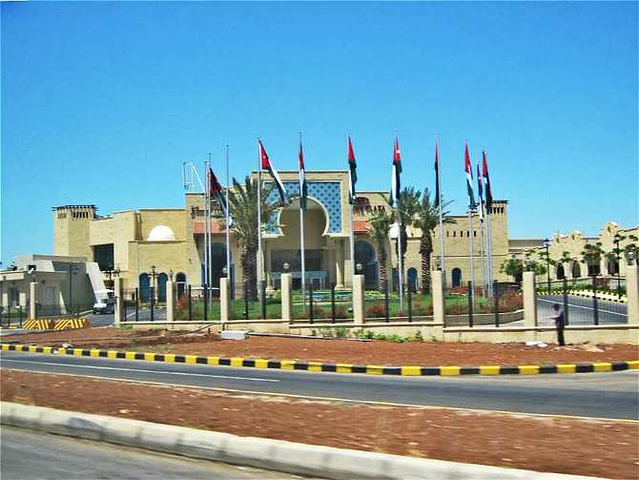 在这里还遇到一个检查岗,司机被警察拦下,也没多盘问,看车里是我们两个中国游客,就放行了。很快就到了公共的Amman beach,不住酒店度假村的,包括旅行团的,都到这里来了。停车场上大车小车很多,我们的司机绕了一圈也没找到树荫下的停车位。本来不想花钱进景区,也没打算漂浮,想在门口远观一下死海就够了,可是到停车场发现,如果不进景区就完全见不到死海,而且如果不入内,只能在停车场晒着。只好花了16JD/人的门票钱入内,票价公示牌上写着本国人要10JD,也不便宜