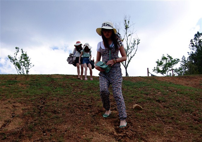 看完日出,突发奇想,决定徒步去大洛水。 做好防晒,强人君君儿和圈圈儿穿着人字拖就跟着我们出发了,4个娇娇女难免一路叫累,幸运的是,出发没走多远,送上门来的便车就停下了,女生的优势也就体现在这里。车里的帅哥开始各种诱惑,中午一起吃饭,晚上一起唱歌,泡吧。。什么都来了。不过防备心超强的我们占了搭便车的便宜,就逃之夭夭了,哈哈哈。