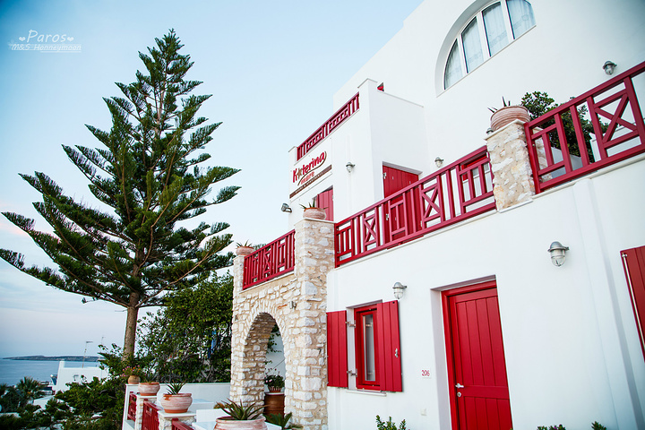 通过奥维互动地图的离线地图指导,很快就到达了Naoussa,还没进镇子,刚过岔路口抬头就见到了一栋显眼的红白房子,就它了!注意快到Naoussa时有两条路,要走右边上坡路就可直接到达酒店门口了,车子就停在酒店门前的空地上即可,这里不是国内,不会被拖车神马的