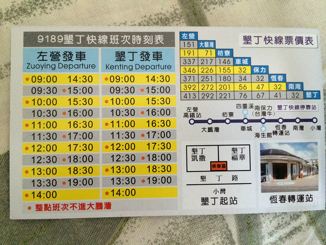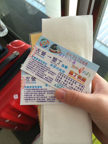 高铁抵达高雄左营的时间为15:00整,坐电梯上来出2口正对着垦丁快线的售票窗口,买的来回票650台币,发车时间为15:30,回程票无日期时间限制.