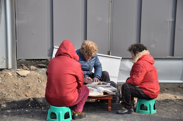 在城墙下摆摊的阿姨。身边放了个炉子生火取暖。