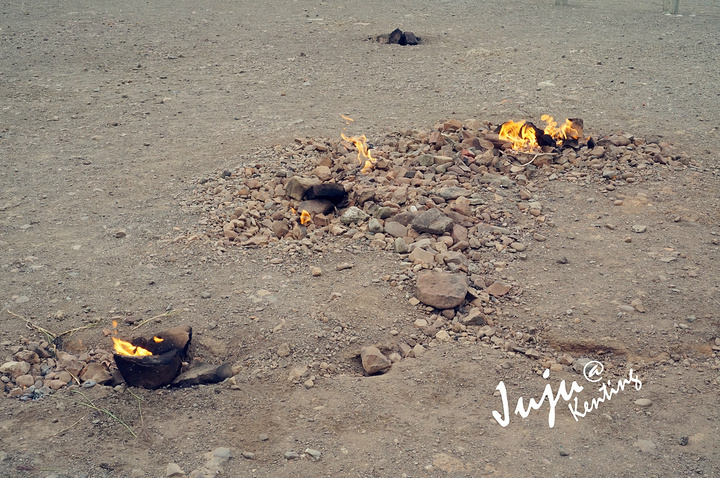 在寸草不生的荒野上,地面上终年冒着火焰.这种出火现象,是因地下天然气冒出,经人为点燃所致,是一项十分珍贵的景观