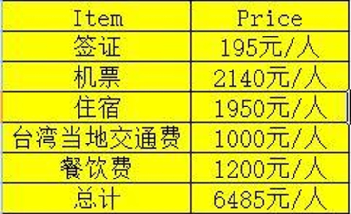 行程的相关花费如下,只包括签证、机票、住宿、台湾当地交通费以及餐饮费,不包括买手信以及化妆品等。台湾和日本一样,手信和药妆的选择太多,伙伴们采购的时候要理智。