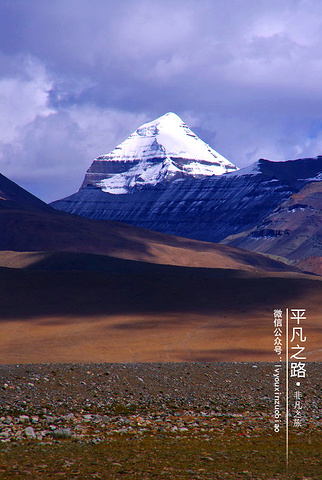 冈底斯山脉的主峰冈仁波齐,位于阿里地区普兰县门士区境内。“冈仁波齐”在藏语里面意为“雪山之宝”。它的造型独特,圆冠形的峰顶终年积雪,像是一个巨大的冰雪金字塔卓立于群山之巅,崇高而威严。其巨大的沟槽在高耸入云的冰雪峰壁上构成了一个巨型的万字符。
