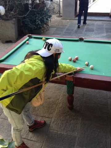 早上起来,打一会台球。我住在大理百合国际青旅,我住的6人间20一晚