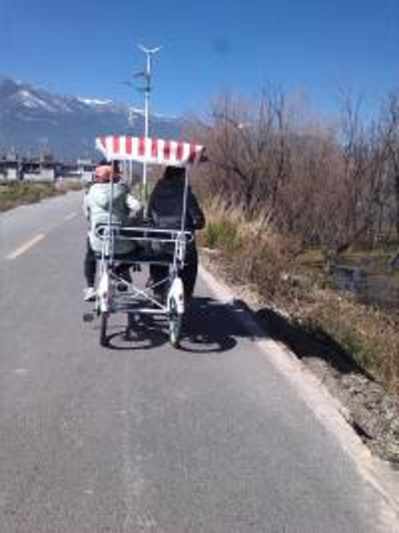 睡觉睡到自然醒,然后到大理古城龙云租车行可以自行讲价在古城博爱路92号和顺的洋人街上去到公路,不要押金.不过要身份证。我们大概是11点租好车,然后出发的。因为同行的5个人有3个不会骑车所以租了一辆4人的50(可以自行讲价)一天,4人的很累和蜗牛一样的速度。我是骑的单人的,20一天。4人的太慢了,所以我们5点才气道喜洲,然后在喜洲的金花饭庄吃了晚饭,然后又骑回大理古城。这一天真的累惨了,第二天起来全身痛,但是屁股最痛。