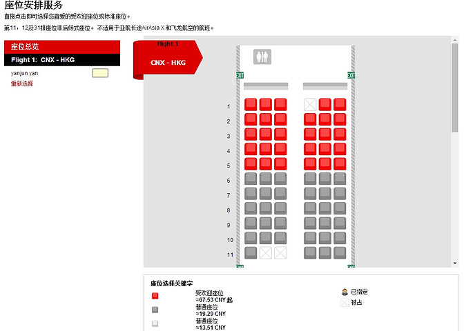 第六步【红色方块】67.53CNY【灰色方块】19.29CNY【白色方块】13.51CNY【白色X方块】表示座位已被占选择座位需要支付相应费用,如果没有选择座位系统将随机为您选座,无需加收费用来自游记人人都可以出国旅行——亚航订票攻略