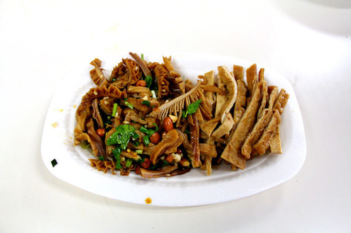 在老板的推荐下我们还点了一些小菜,比较推荐的是右边的卤水豆皮,味道真的很赞很入味,在店里面你会看到很多人都点了一份豆皮。不过牛肚和牛百叶虽然也很入味,不过很硬,所以个人不是很推荐啦。