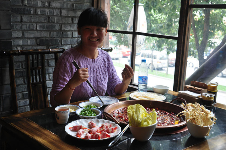 第二天八点醒了,累的还是不怎么想动。洗过澡后躺着给大家聊聊天,十一点退房坐10到春熙路,巴蜀隆门火锅。服务员知道我一个人很诧异。我告知她,我是出来旅行,一个人,所以没有同伴一起吃饭。如果不是CFF支持我去,我也许还真没勇气一个人吃火锅,毕竟在家也没有一个人这样子。火锅店很大,避免高峰期,我算好的时间11:30到了,不仅是第一个顾客,也是唯一一个顾客。很大一盆锅底,锅底费58。点了当地的仔姜牛肉卷,娃娃菜,金针菇,腐竹,莲藕。都是我喜欢吃的,紧着不浪费,我又爱吃,能吃完。没有烩面,面条,这对爱吃煮烩面的我来说真心遗憾呀,灵机一动,我包里还有带来的方便面,早上还踌躇吃不掉还得带回家,这下子一举两得了。哈哈哈!服务员叫我煮方便面,都觉得好好玩,我成了他们几个好奇的对象,大家都围着我转。还帮我拍照留念成都火锅。一向爱吃辣的我,这次也没hold 住。成都火锅没有芝麻酱,有油料,我没有要。饭菜太麻了,火锅遇到麻椒我就不行,容易反胃,所以后来用开水冲了菜吃的,最后几个娃娃菜还是被我剩下了。那份方便面就跟漂亮了,煮好的放在碗里,为了拍照美美的,吃起来棒棒的,我把葱末和香菜末撒上去,很唯美。呵呵。这是外出最正式的大餐了。饱饱的我,在服务员建议下,放弃宽窄巷,去了武侯祠的锦里。门口拍照后,走进武侯祠,很多国内外游客,这里是成都有名的古建筑小吃街,不需要门票。乌衣巷也包含其中。站台旁的金桂泛着橘黄很耀眼,四川的桂花与郑州很明显的地方就是花多叶少。转成57到成都标志的天府广场。很简单的地方,没有预期的壮观。百度也夸大其词。四处都是警察,天府广场下面就是地铁站,2块钱坐一号线到成都北站。我是网上购票,第一次什么我也不懂,看到售票处外面的网购换票处就去了。旁边的乘客说身份证放在感应器按下确认就好了,果不其然,出来我的明细和打印好的火车票,有别于传统橘色背景票,这个底色是蓝色的。此时下午4点还早,可能中午火锅吃的内心好热,一直喝水温度也下不来,去德克士吃了冰激凌好了一些直坐到八点进候车厅。还有四个小时,可我瞌睡的不能行,趴着仰着,吵闹的候车厅也能让我睡着,可想而知我有多累。12点的火车晚了半个小时,一路上走走停停,也不知什么原因,天还没亮就晚了两个小时,上车手机都没什么电了,还是隔壁的乘客借用他的充电宝给我,现在可以听着歌写日记的。好不靠谱的攀枝花到北京站,真心受不了。途中赶了赶,到现在还有半小时差距。下车也要九点半了回到我的小屋也得十点了。