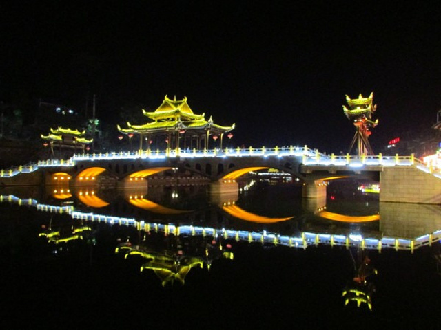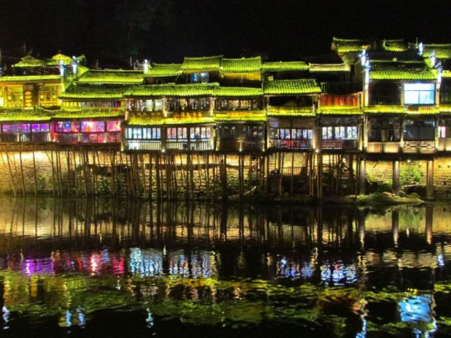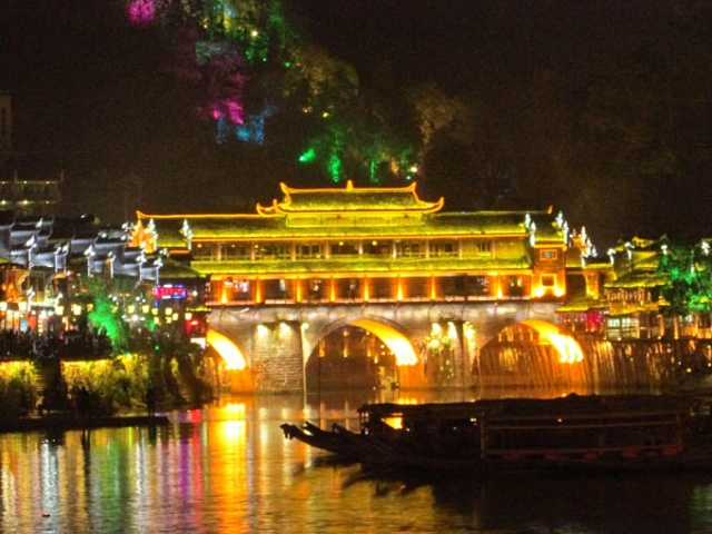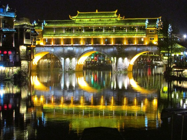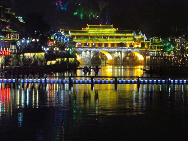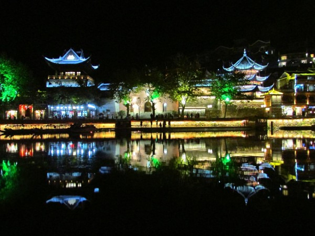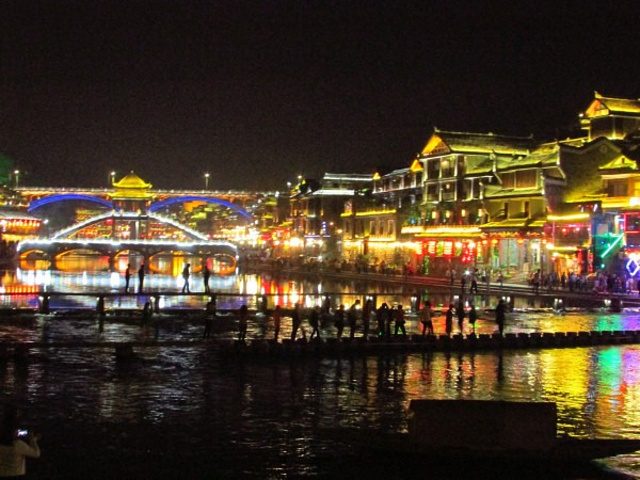 沱江两岸一片灯光璀璨,五光十色,错落有致,那些真古的、仿古的建筑全部披上一层亮丽的彩灯外衣,在夜色中争相夺目,倒映在沱江中,构成了一幅绚丽多彩的迷人的夜景画面。在彩灯辉映下,最热闹的要数各色酒吧,高分贝歌声乐曲声,此起彼伏,一派喧嚣,与那些古建筑形成了强烈的反差,从白天到黑夜好似穿越古今,喧闹声直到半夜才渐渐停息。我想,凤凰古城的卖点不是风景,也不是商品,而是一种心情,一种矛盾的心情,树欲静而风不止,想沉静又不免躁动,在古朴氛围中寻求现代感,在文化原生态中彻底释放自我。凤凰古城不大,两三个小时可以兜遍,但要走遍每一条小巷和景点,加上看夜景,就需要一整天时间,