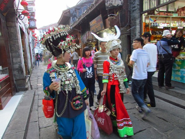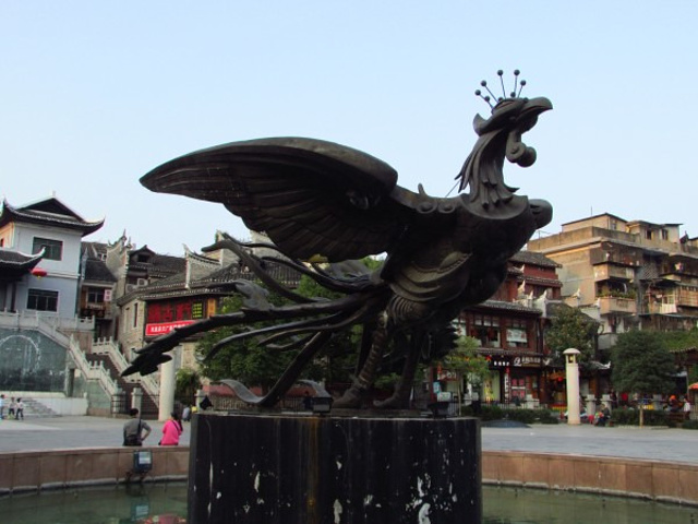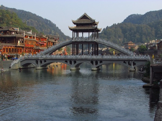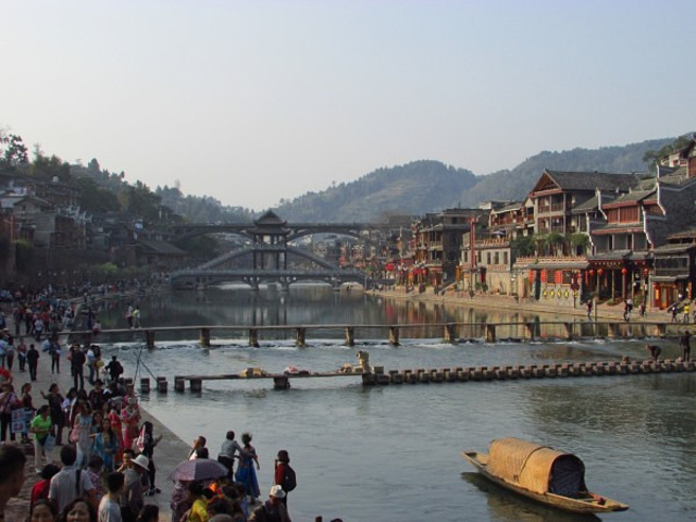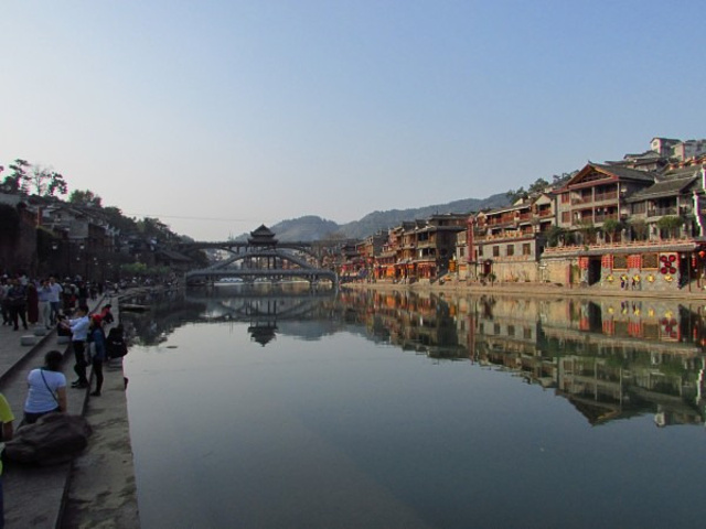 上午乘九点半大巴去凤凰古城,下午一点多到达凤凰县城北汽车站,还没到站,车上不知什么时候出现了一个当地导游,自称是凤凰汽车站工作人员,反复告诫游客不要坐黑车,还热心地介绍了古城内情况,表示可以免费代订长途车票并送票上门。到了凤凰城北汽车站,换去古城的中巴,车费5元。这时又上来了一个女导游,介绍了凤凰古城的游览项目,包括篝火晚会、苗寨一日游等。我看他们貌似正规,反正我们也要去苗寨玩,就报了明天苗寨一日游,付了120元。下车后在沱江风桥边找了家客栈住下,临江房100元,我怕吵,要了间不临江的双人房60元,房间很小,但设施还行。然后我们又订好了回程火车票,一切妥当后便开始游览古城。凤凰古城实行联票,票价148元,我们询问老板如何能逃票进去?老板在地图上为我们标识出了各验票点的位置,一共有六个哨卡,除了第一个沙湾哨卡可以凭住宿客栈押金单进去外,其余都要出示门票或证件才能放行,如果能绕开这些哨卡就能逃票进入古城,为此老板还为我们标出了绕行路线,不熟悉地形的人还真不知道怎么绕,但要到古城内的一些景点内参观就逃不了验票了。如果你只想看下吊脚楼,完全不必买票进入古城内,在沙湾就能看到,也算是管理方网开一面吧。整个古城,就是一个大型商城,店铺一间挨一间,就象上海豫园,从小商品、百货到餐馆、酒吧,应有尽有,各具特色,最多的还是旅店客栈,商业气息很浓。城里有一些古建筑,如杨家祠堂、崇德堂、天后宫、古城楼及名人故居等,进入参观还得验票。这些古建筑完全淹没在商铺的海洋中,连点缀也谈不上,倒是沱江边吊脚楼堪称一道颇具特色的风景线。值得一提的是古城夜景,与白天风格完全不同,