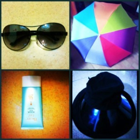 防晒必备品,防紫外线的太阳伞最好色彩丰富些,这样照起相来一定很出彩,墨镜既然可以防太阳强光,也是照相扮酷必不可少的道具之一,防晒露是爱美女士随身一宝,还有防紫外线帽子,是不打伞的时候最方便防晒物品啦。