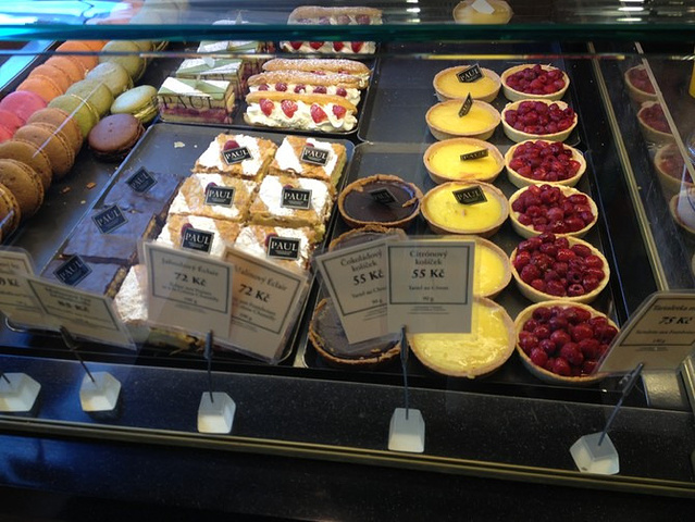 之后瓦茨拉夫大街上找了一家免手续费的汇率较划算的换汇点换了克朗,终于定下心来^_^(瓦茨拉夫大街上有家很大的KB银行,就在甜品店PAUL的旁边,我们试了试还是取不出现金,不知为何)法国甜品店PAUL在布拉格的分店蛮多的,我看到好几家。进去喝了杯卡布奇诺吃了个树莓挞,卡布奇诺太让人失望,味道寡淡不说,泡沫形状真是恶心啊 我顿时想到了周立波说的“吐口水”。。。