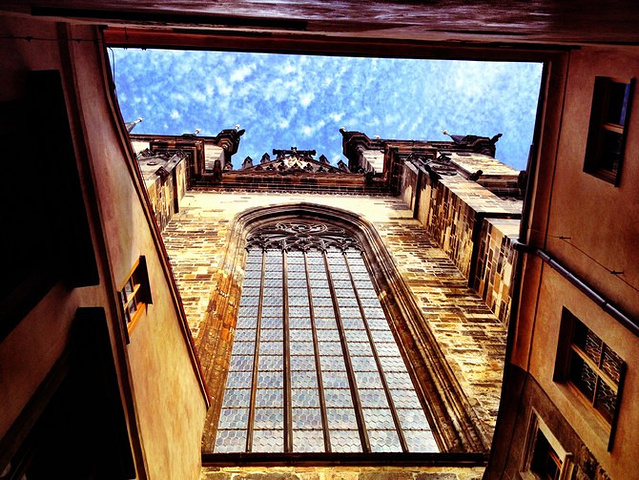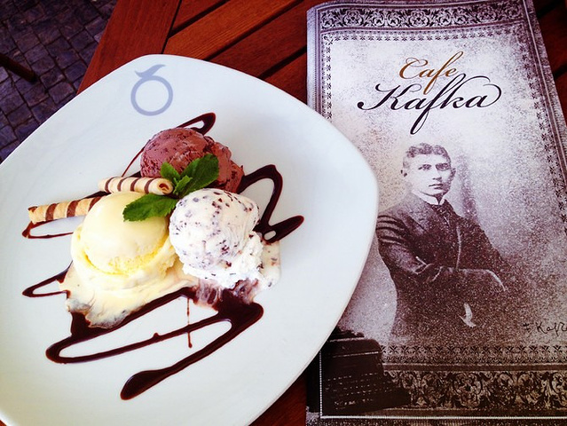 从火药塔下来,两人都觉得疲惫,想来是没有吃午餐到底体力跟不上啊!于是沿着街道步行至老城广场,在著名的卡夫卡咖啡馆坐下。这家CAFE之所以用卡夫卡的名字命名,是因为大作家卡夫卡生前一直在这家咖啡馆写作。