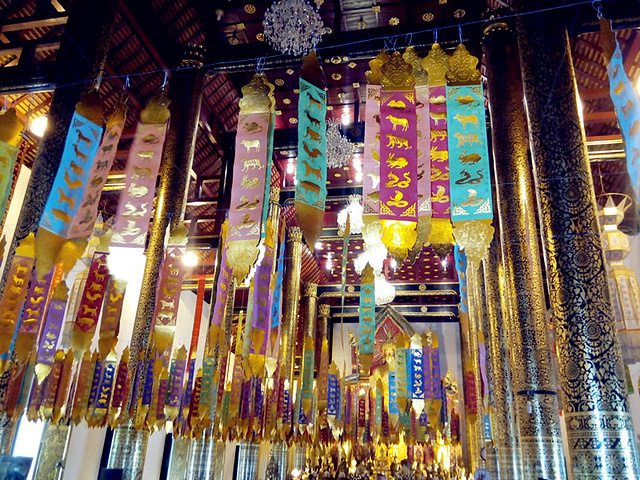 进入泰国的寺院一般都不允许穿露肩的上衣或者短裤短裙的,清迈古城里的寺院一般门口都备有罩衣或者大的方巾以备人们进入里面时弥补穿着的标准,而且进入寺庙的佛殿里时是要在门口脱鞋的。