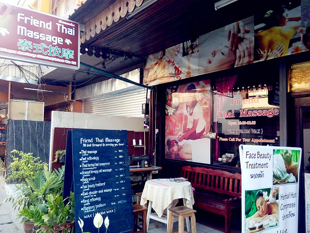 找了一家价格合适的泰式按摩店(那里有很多这种店)180铢/人,全身按摩,从脚到头,按完后感觉全身都被抻开了,非常的舒服,时间一个小时。