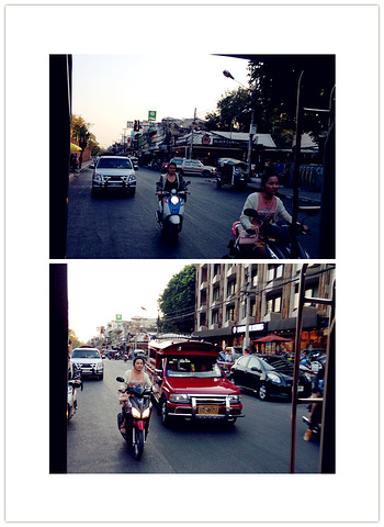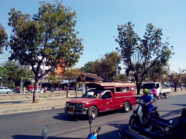 做完泰式按摩,已经下午五点了,想找tu tu回长途巴士站,可能是时间晚了,所以这种车要价贵了,回去有的要200铢,有的要150铢,非常不合适,最后找了辆双条车,两人100铢,拉回巴士站。