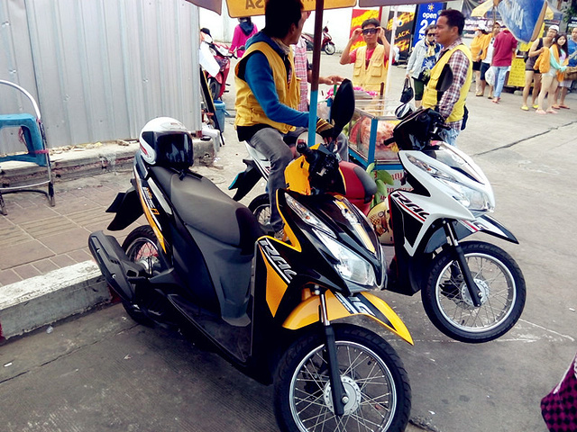 这里的海滩非常热闹,有很当地人举着海岛游的项目广告问你要不要坐船去海岛或者玩海上的娱乐项目。因为时间的关系,我们在这里没有玩任何项目,在海边呆了会算是看过这里的海滩了,然后找了辆当地的摩托车送我们回到长途巴士站,骑摩托车的大哥超强,一辆车带我们两个人回去,并且骑的非常快速,80铢。