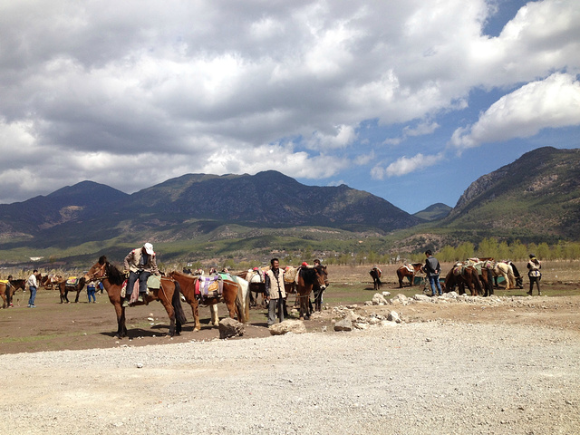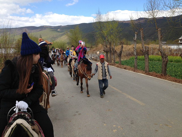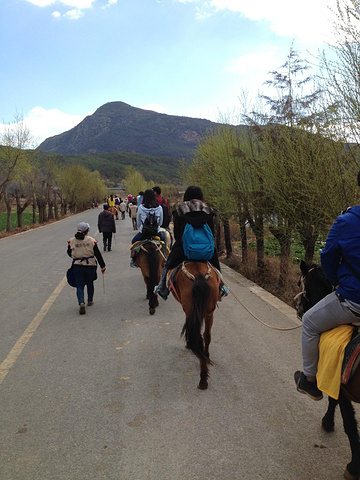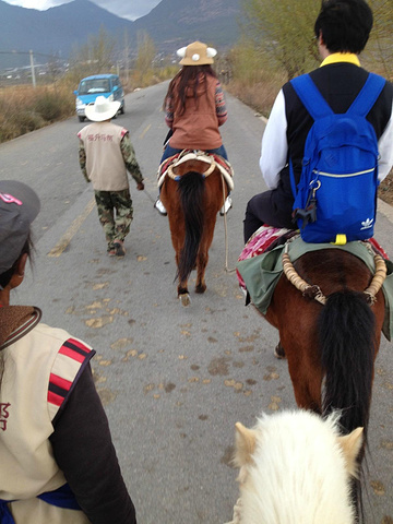 大概每3匹马会有一个人带着,很安全的。先是走过一段柏油路,两边是青青的农田。到了后面就是泥石山路了,要抓稳马鞍,所以就没空手拍照了~