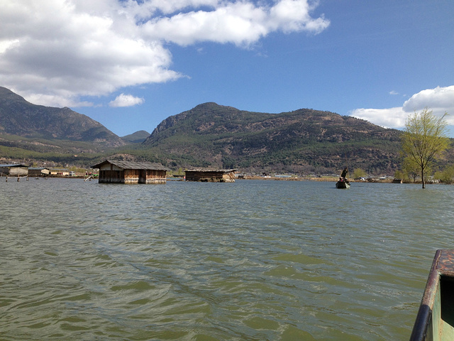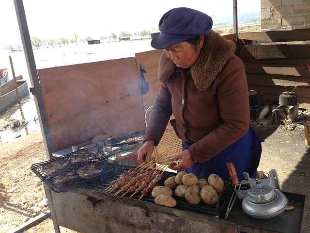划船上来后还有小吃(划船、这个小吃都是包在团费里的),马铃薯、牦牛肉串和纳西烤鱼三选一,我是选了烤鱼啦,挺美味的。丽江这边很多小摊档都卖烤马铃薯,味道也是可以的。