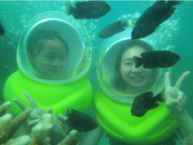 坐大巴去到海岸转乘快艇到金沙岛水上活动,由于跟团时间紧迫,所以泳衣我们换好了再套到衣服里面。我们玩了香蕉船、海底慢步(香蕉船800铢、海底慢步1600铢)比国内便宜多了海底拍照cd一人180铢,可质量不想多说有多搞笑。来自游记不用计划的泰国曼谷芭提雅新年跟团游