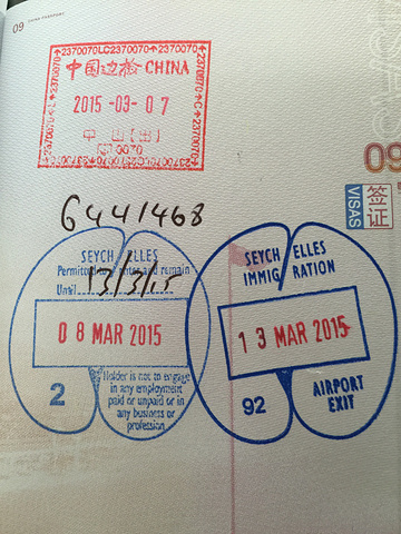 塞舌尔是落地签的,不用提前办理签证,只需携带包括半年有效期以上的护照就可以了,下飞机之后填写入境卡,然后回答入境处官员的问题,说明来由,在赛舍尔待几天,出示住宿预定清单和回程机票,就可以了,入境处官员就会在护照上盖上椰子状可爱印章,可以进入塞舌尔啦~