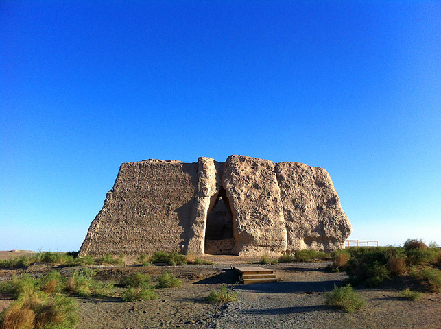 虽已没有了当年的壮观,但进入茫茫戈壁之上挺立的小城,可以在废墟中想象当年的盛景,感叹历史和时光的沧桑变化,怀古之情油然而生,莫不是一种特别的体验。城墙前是一块大石碑,上书“小方盘城遗址”,在城墙另一边较远处有另外一块石碑,上写“玉门关遗址”,可以前往拍照留念。