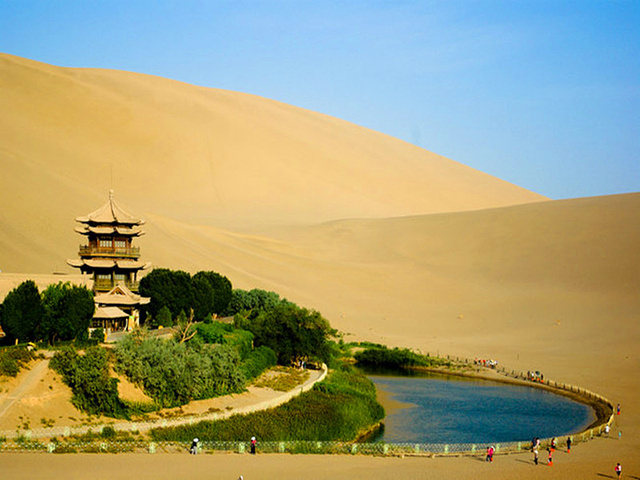 鸣沙山的山体由流沙堆积而成,远远望去,沙丘高低起伏,蔚为壮观。当游客从山顶下滑时,就会听到咚咚咚的响声,似敲锣打鼓,让人胆战心惊又颇感刺激,鸣沙山因此得名。月牙泉位于鸣沙山下,处在沙丘环抱之中,因为地势的关系,刮风时沙子不往山下走,而是往山上流动,所以月牙泉永远不会被沙子埋没。