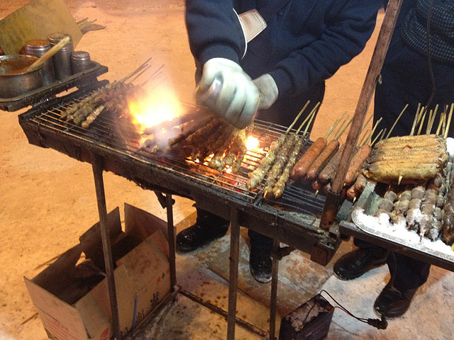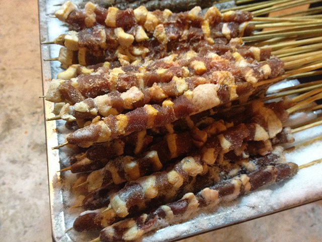 宾馆周边,也就是火车站周边吃的极多。路边的羊肉串,20块8串,这个价格这个大小的肉串在杭州已经绝种了,要我说我那边的羊肉串,那只够塞牙缝!一人四串塞进肚子里,满足感油然而生,两个字,实在!