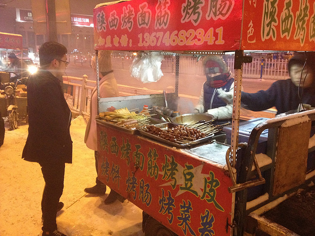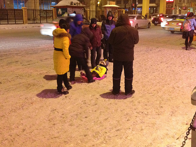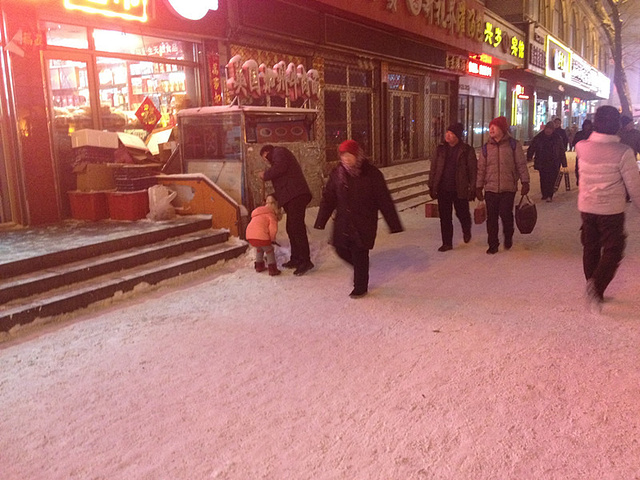 粥铺外的大街,雪板上的熊孩子被大人拉着绳子,就这么直接在雪地上滑行了。。。大雪后的哈尔滨,街上很滑,人们穿着臃肿的衣服像企鹅一样蹒跚走路,一不小心就在地上打了个滚,自己也是以这个姿势在走,看着这幅画面,突然就觉得有趣极了。