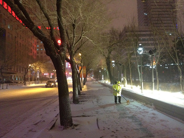 这么晚了,环卫工还在辛勤地清扫积雪,说是清扫,也只能说稍微往旁边扫成一堆,人行道上不时可见小腿高的雪堆。