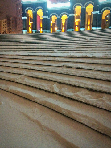 果戈里大街旁的广场,台阶上的积雪看着就和沙丘一样,最下面的这个台阶,你看已经完全被白雪填平了。走过这里,然后在雪堆里留下一个个很深的大脚印。