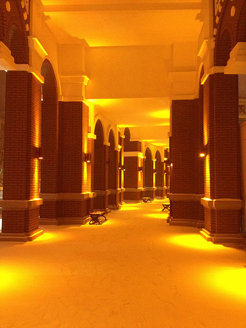 台阶上方的连廊内也已铺满白色的“地砖”,乍一看,你以为平整的地面真是地砖呢,难以想象之前的风雪有多大,竟然把有遮掩的连廊内部装饰成了这样。。。