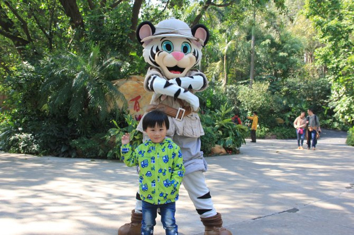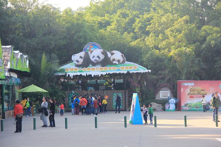 也许是因为淡季,这会儿真没有那么多人来长隆动物园,9点多到达景区北门(我们住在北门附近),也就排了50多个人的队伍,自动取票机也没有几个人,很快我就刷到门票了!仔仔穿鞋刚好1米+,脱鞋0.99米,问了工作人员,很幸运没有花175元的门票钱! 大门口除了验票,依旧还是要验包的!任何能进嘴巴的食物都不允许带进去,如果您不小心带了可以寄存,出来的时候再取!验票验包进入景区后,有租婴儿车的地方,50元一天,有宝宝不大愿意走路的可以租个婴儿车,累了还可以给他睡觉!进园要做的第一件事情就是取一张景区导览地图,非常有用!第二件事情就是去看当天的表演时间安排!第三件事情就是规划好你的路线和观看表演的时间!我们就是直接把路线用箭头在导览图上画出来,把每个剧场的演出时间标记好,如果路线安排合理还是能把整个园区参观完的!