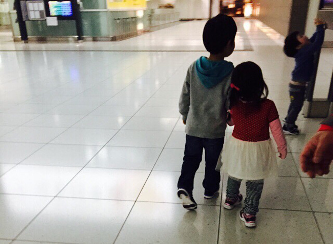 最后我们离开航站楼的时候,遇到的三个萌萌哒日本小朋友。哥哥总是这样牵着妹妹😊最后他们三个手拉手蹦蹦跳跳地离开了