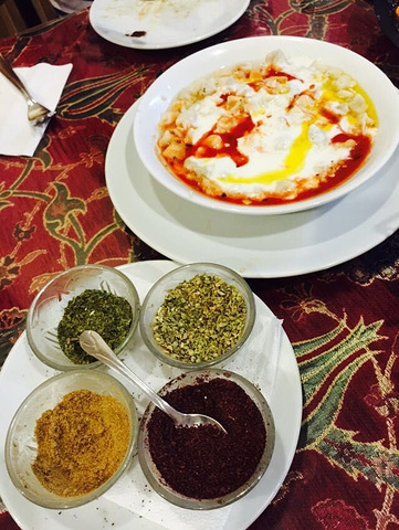 这道有点类似面疙瘩,旁边四小盘是搭配的香料,有个是薄荷其他不是很记得了