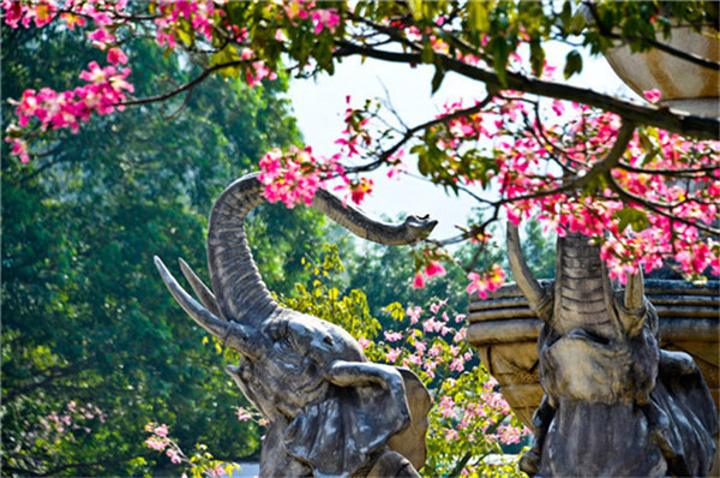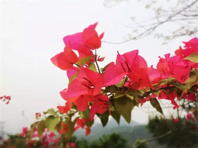 《山海经》里讲夸父“充其杖化邓林”。邓林即桃林。在很多神话故事、影视作品里面都有桃花的身影。十里桃林, 灼 灼芳华。观音山桃林顺着坡势,傍山而种,由观音山全体员工精心栽植,因时间不久,故未蔚然成林,但桃花正开,亦是桃之夭夭。日后长成必将成为广东省内赏桃花的又一好去处。