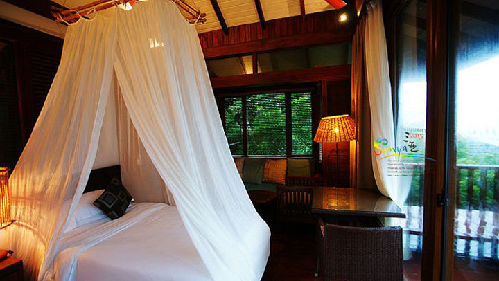 曲径通幽的热带雨林里栈道里,推开房间的木门,眼前一亮……