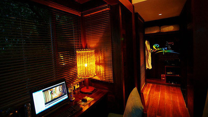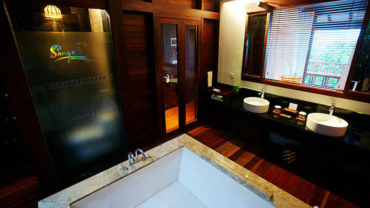 房间由钢结构外包实木条装饰,屋顶覆盖毛草,原生态的野趣浓郁,房间所有家俱都是红木,古朴、奢华而不张扬,床头柜上摆放着红木雕刻首饰盒,硕大的淋浴间和卫生间独立设计,卫生间的中间是宽达3.3米的巨大泡池。 卧室的东南亚风情浓郁,以木材为主要建材,空间充分发挥木材的物理性能,浅色调朴素的实木成就着一个异域风情的活动区域。卧室里,从地板、天花、墙面的用材到艺术品的存在,无不在诉说着一个隐藏在热带密林中的东南亚风情的空间。
