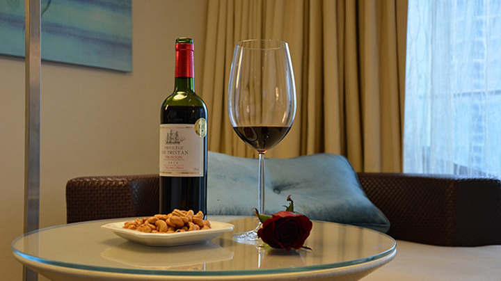 回酒店后,思绪仍然十分凌乱,本来打算去酒吧喝两杯,但想到外面台风天刮风下雨的,就打退堂鼓了,实在是懒得动了,刚好在去哪儿网找的这家SD进口红酒会所,打电话联系,客服说可以直接送酒店,我是在他们家微信订购的,“ SD红酒”微信公众号可以提前预定送过来的时间,很方便,订了一瓶法国龙船古堡干红和一份腰果小吃,送过来的时候袋子里还装着一朵玫瑰,红酒配玫瑰,老板还想的挺浪漫,呵呵,红酒是法国进口的,口感醇厚,果香浓郁,口感很正宗在国内算是很难得的进口红酒了,价格也不贵,比在酒店买的要实惠的多。