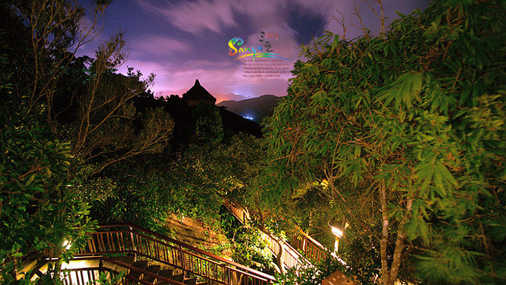 晚餐后回房间的间隙,台风仍然在肆虐横行,站到全木结构的泰餐厅的回廊上,左面正对海湾吹来的夹着海水的飓风,人站立不稳,我正要后悔无法拍到眼前这迷幻的台风暴风雨中的光影变化,一位打着伞的美女从我旁边经过,我毫不犹豫地迎着暴雨拿出相机瞬间按下快门,定格了这风雨中迷幻的光影……